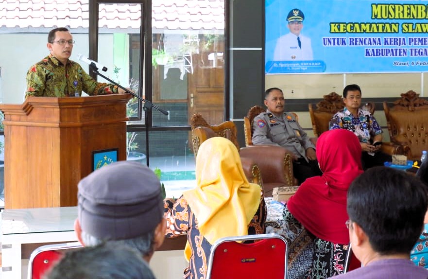 Pj Bupati Tegal Agustyarsyah saat membuka kegiatan Musrenbangcam tingkat Kecamatan Slawi di Pendopo Kantor Kecamatan Slawi, Selasa (06/02/2024).