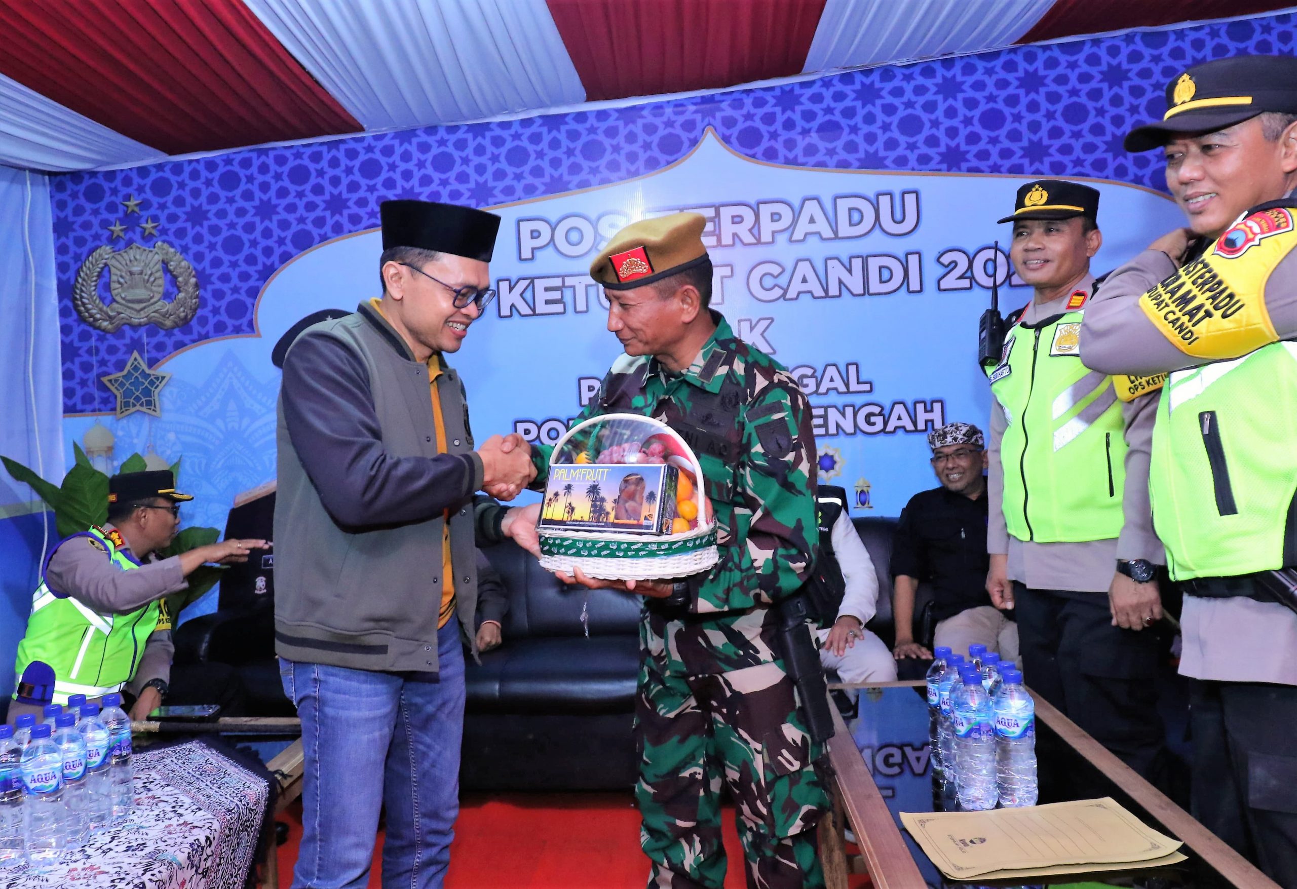 Sekda Kabupaten Tegal Amir Makhmud bersama unsur Forkopimda Kabupaten Tegal menyerahkan bingkisan kepada petugas jaga di Pos Terpadu Operasi Ketupat Candi, Minggu (07/04/2024).