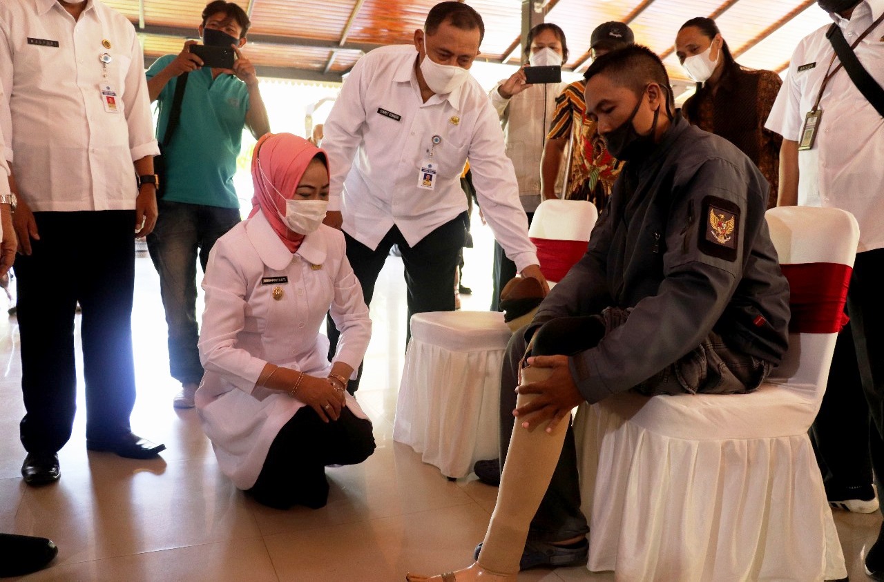 “Walau memiliki kekurangan, saya yakin asal ada kemauan yang kuat, kalian mampu melakukan berbagai pekerjaan dan berkarya yang gemilang, janganlah keterbatasan yang dimilikinya menjadi alasan untuk menyerah,” katanya saat memberikan kaki palsu gratis di Pendopo Bupati, Rabu (16/6/2021).