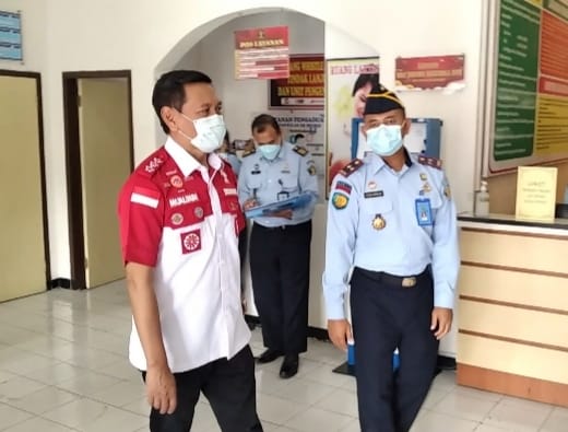 MENINJAU - Dirjen HAM Kemenkumham RI, Mualimin Abdi didampingi Kalapas Kelas IIB Brebes, Isnawan, meninjau sejumlah fasilitas dari sisi HAM yang ada di Lapas Kelas IIB Brebes, Kanwil Kemenkumham Jateng, Selasa (29/3/2022).
