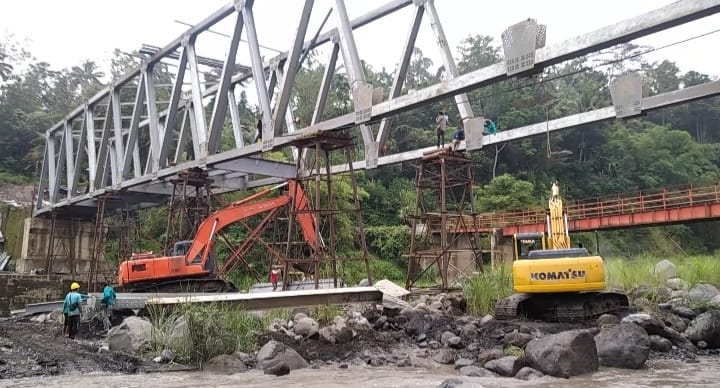 “Pijakan tiang penyangga yang berupa pasir dan batu tergerus derasnya air sungai, akibatnya terjadi penurunan konstruksi besi jembatan sekitar 25 centimeter,”ujar Slamet Paka, selaku pelaksana proyek saat ditemui di lokasi pekerjaan, Selasa (21/12/2021).