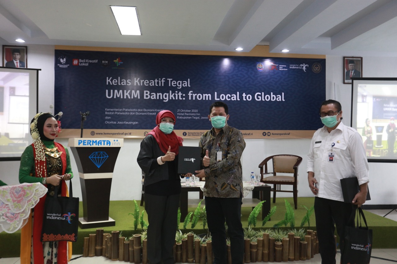 SLAWI, korantegal.com – Pulihkan kondisi perekonomian akibat pandemi Covid-19, Otoritas Jasa Keuangan (OJK) Tegal gandeng Kementerian Pariwisata dan Ekonomi Kreatif (Kemenparekraf) gelar Pelatihan Kelas Kreatif bagi pelaku usaha mikro, kecil dan menengah di Hotel Permata Inn, Slawi, Rabu (21/10/2020). Pelatihan bertajuk UMKM Bangkit : From Local to Global ini dibuka oleh Sekretaris Daerah Kabupaten Tegal Widodo Joko Mulyono.