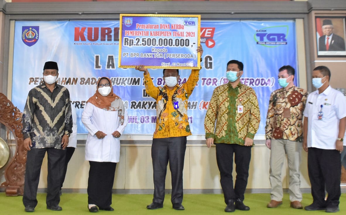 SLAWI, korantegal.com – Pemerintah Kabupaten Tegal gelontorkan dana senilai Rp 2,5 miliar kepada PT BPR Bank Tegal Gotong Royong (TGR) untuk digulirkan sebagai pinjaman modal kepada pelaku usaha mikro melalui Program Kredit Usaha Rakyat (KUR) Daerah. Melalui stimulus kredit pinjaman berbunga rendah setara 0,26 persen per bulan ini, Bupati Tegal Umi Azizah berharap bisa membantu menumbuhkan perekonomian di wilayahnya agar prospek pemulihan ekonomi ke depannya semakin baik.