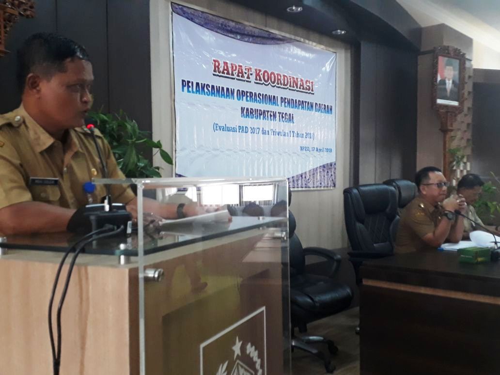SLAWI, korantegal.com – Pemerintah Kabupaten (Pemkab) Tegal melalui Badan Pengelolaan Pendapatan Daerah (BP2D) merilis laporan realisasi Pendapatan Asli Daerah (PAD) untuk triwulan I tahun 2018 mencapai Rp. 94.163.356.491 atau 23,55 % dari target PAD Rp. 399.909.505.000. Hal ini terungkap dalam rapat koordinasi pengelolaan pendapatan daerah Kabupaten Tegal yang dipimpin secara langsung oleh Penjabat Sementara (Pjs) Bupati Tegal di Ruang Rapat Bupati, Selasa (17/4).