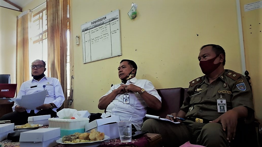 Dari kiri ke kanan, Kepala DPMPTSP Kabupaten Tegal Fakihurrohman, Inspektur Pembantu III Santoso Budiyo Waskito dan Kasi Penyelidikan dan Penyidikan Satpol PP Tavip Mulyartomi saat menggelar rapat koordinasi tindak lanjut lapor Bupati Tegal di Kantor DPMPTSP Kabupaten Tegal, Rabu (02/09/2020).