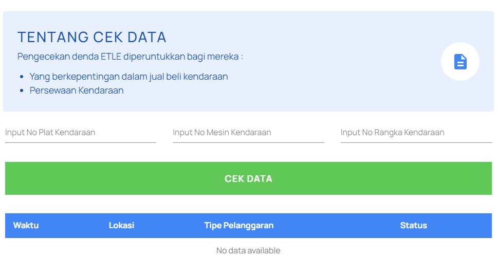 Setelahnya, kemudian klik tombol cek data. Jika belum pernah melakukan pelanggaran akan muncul tulisan ‘no data available’ atau data tidak ditemukan. Sementara, jika sudah pernah melakukan pelanggaran akan digabungkan dengan tagihan saat membayar pajak tahunan kendaraan.