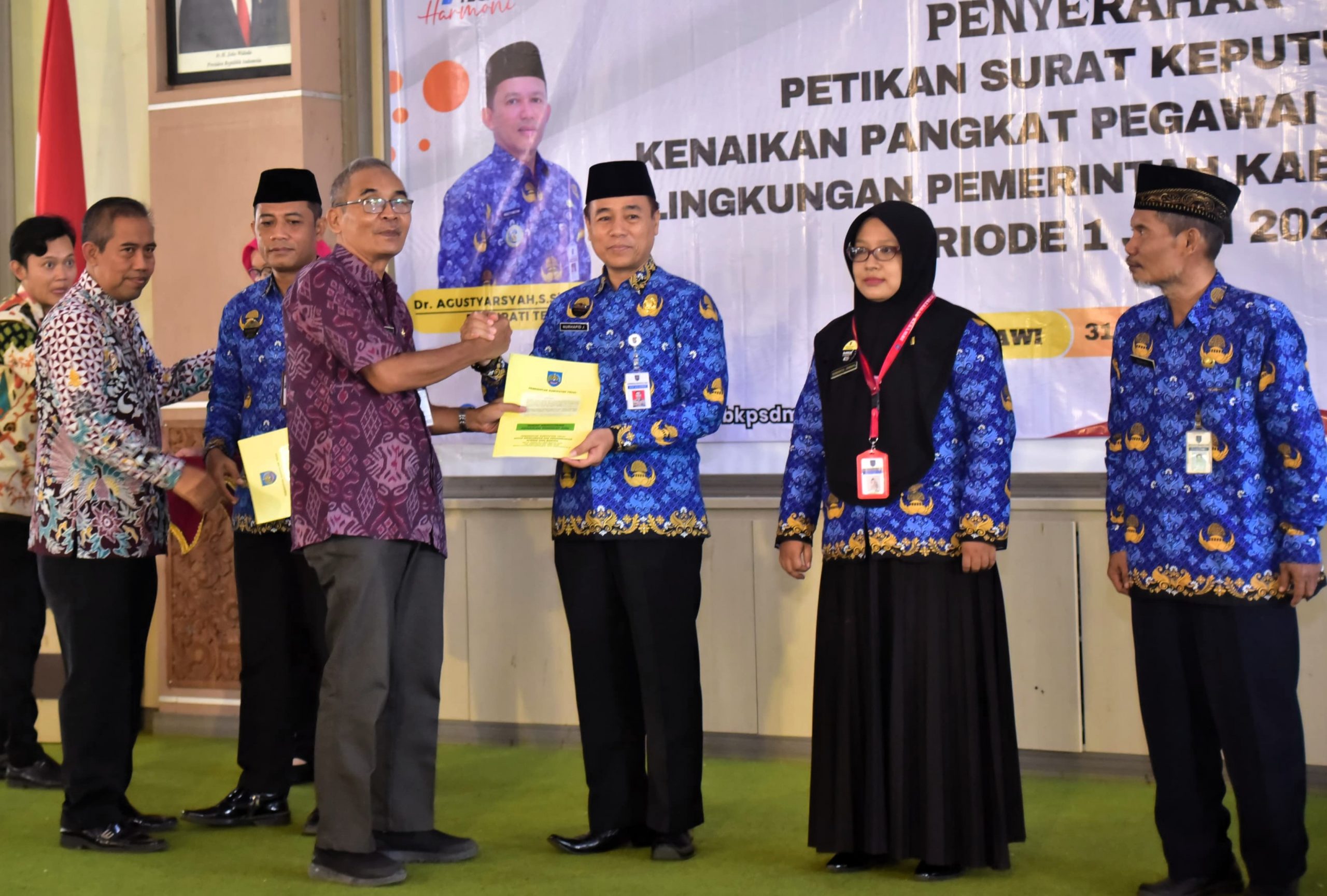 Slawi – Sebanyak 709 pegawai negeri sipil (PNS) di lingkungan Pemerintah Kabupataen Tegal menerima surat keputusan (SK) kenaikan pangkat melalui Badan Kepegawaian dan Pengembangan Sumber Daya Manusia (BKPSDM) Kabupaten Tegal. Penyerahan SK tersebut berlangsung di Pendopo Amangkurat, Jumat (31/05/2024). Adapun SK kenaikan pangkat ini diberikan kepada 350 orang PNS golongan IVa ke atas dan 359 orang PNS golongan IIId ke bawah.