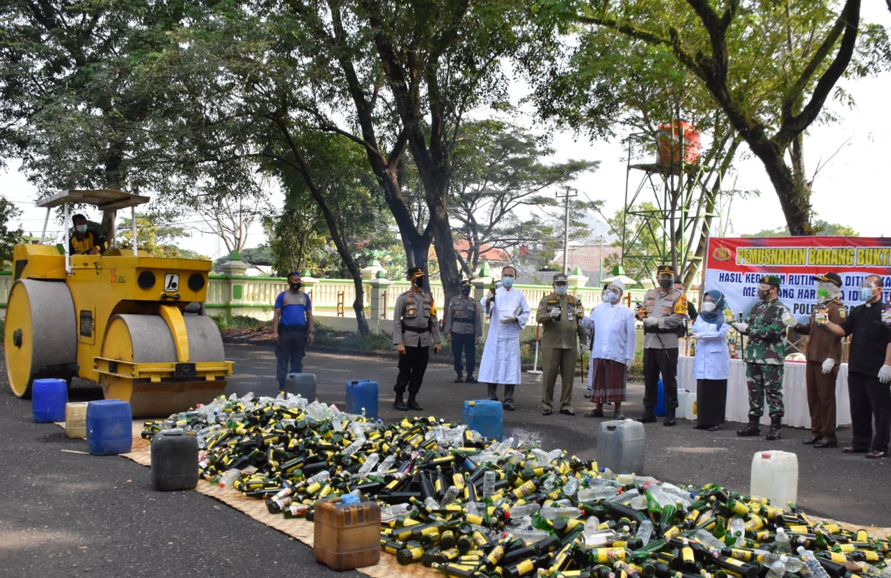 SLAWI, korantegal.com – Bupati Tegal Umi Azizah menyaksikan pemusnahan barang bukti 8.000 botol minuman keras (miras) usai pimpin Apel Gelar Pasukan Operasi Ketupat 2021 di lapangan Pemda pada Rabu (05/05/2021). Pemusnahan miras hasil sita perkara pidana ringan penjualan dari berbagai jenis dan merek tersebut, dipimpin langsung Kepala Kepolisian Resor (Kapolres) Tegal AKBP Muhammad Iqbal Simatupang dan disaksikan unsur Forum Komunikasi Pimpinan Daerah (Forkopimda) Kabupaten Tegal.