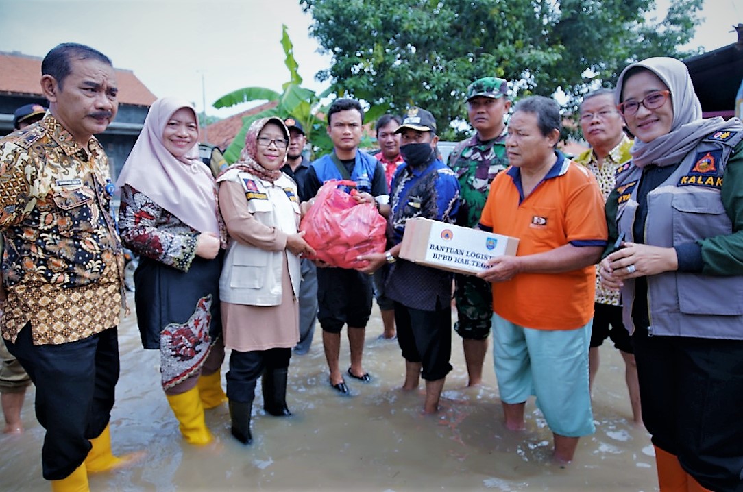 Slawi – Sebanyak 2.794 warga di tujuh desa terdampak banjir pasca hujan lebat yang mengguyur wilayah Kabupaten Tegal pada Rabu (04/01/2023) petang hingga malam. Mendapat kabar kejadian bencana ini, Bupati Tegal Umi Azizah didampingi Kepala Pelaksana Badan Penanggulangan Bencana Daerah (BPBD) Kabupaten Tegal Elliya Hidayah dan Pelaksana Tugas Kepala Dinas Sosial Kabupaten Tegal Nurhayati salurkan bantuan lewat balai desa setempat, Kamis, (05/01/2023) pagi.