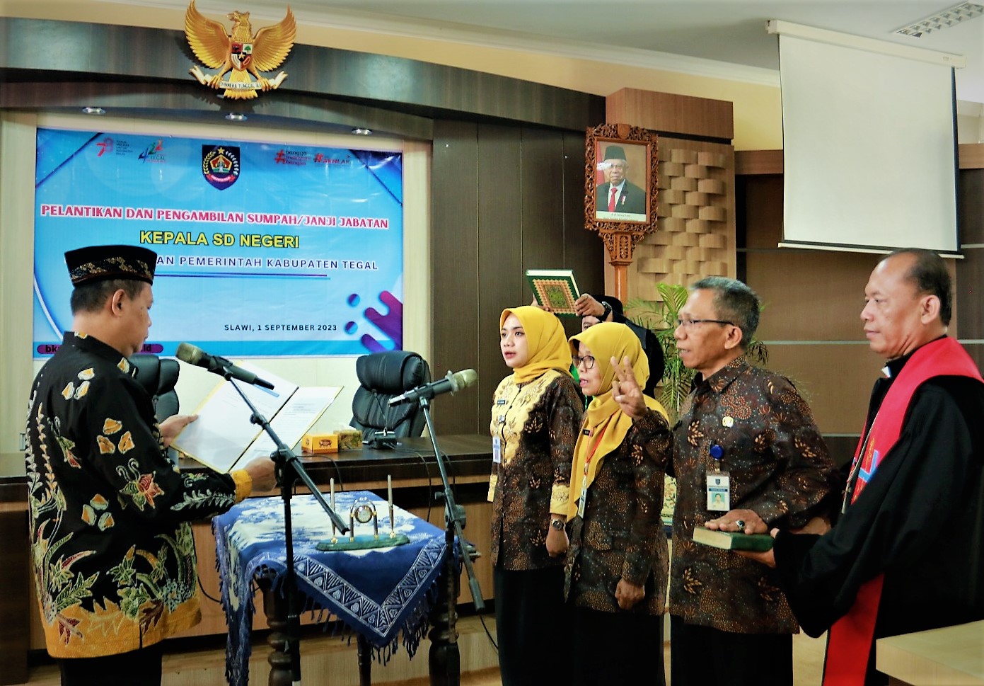 Slawi – Kepala sekolah diminta transparan dan akuntabel dalam mengelola dana bantuan operasional sekolah (BOS) untuk mencegah penyelewengan atau menjadi objek kepentingan pihak-pihak tertentu. Pesan ini disampaikan Bupati Tegal Umi Azizah melalui Asisten Administrasi Umum Sekda Kabupaten Tegal Fakihurrohim saat melantik tiga orang Kepala Sekolah Dasar Negeri (SDN) di Ruang Rapat Bupati Tegal, Jumat (01/09/2023).