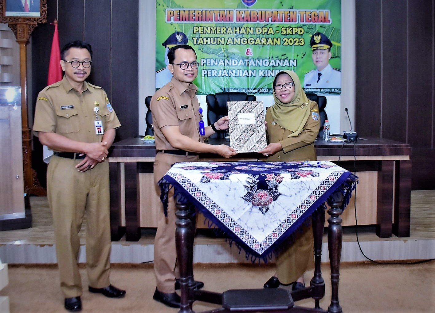 Slawi – Bupati Tegal Umi Azizah menyerahkan dokumen pelaksanaan anggaran satuan kerja perangkat daerah (DPA-SKPD) sebagai panduan pelaksanaan belanja APBD Kabupaten Tegal 2023 senilai Rp2,95 triliun ke 45 kepala organisasi perangkat daerah (OPD), termasuk camat. Penyerahan ini berlangsung di Ruang Rapat Bupati Tegal, Selasa (10/01/2023).