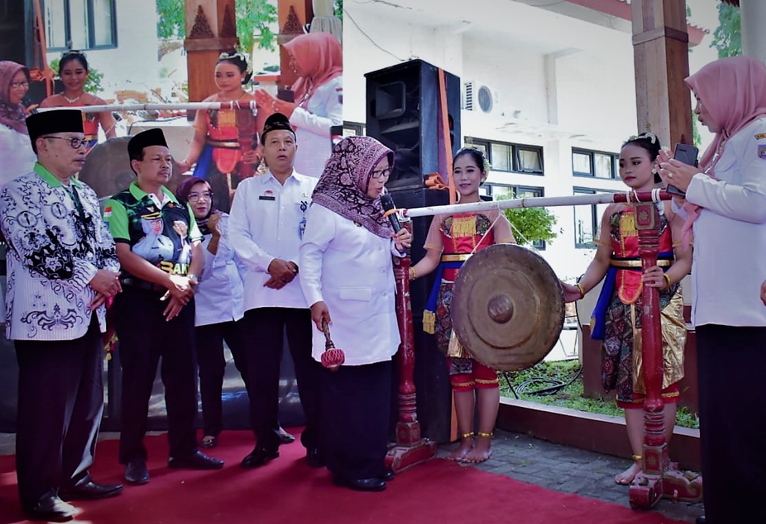 Disaksikan sejumlah kepala perangkat daerah, Bupati Tegal Umi Azizah memukul gong tanda diresmikannya penggunaan aplikasi SiBakti di Galeri Seni Dinas Pendidikan dan Kebudayaan Kabupaten Tegal, Rabu (12/07/2023).