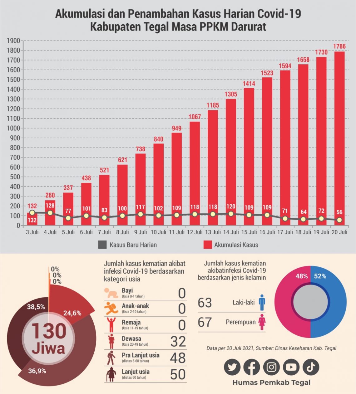 Umi mengungkapkan, penurunan kasus penularan Covid-19 secara nasional juga dialami Kabupaten Tegal. Penurunan tersebut baru terjadi setelah dua minggu PPKM darurat diberlakukan. Sebelumnya, selama 14 hari jumlah pasien Covid-19 bertambah rata-rata 109 kasus per hari. Memasuki hari ke-15 hingga ke-18 atau Selasa (20/07/2021) kemarin, rata-rata penambahannya 65 kasus per hari.