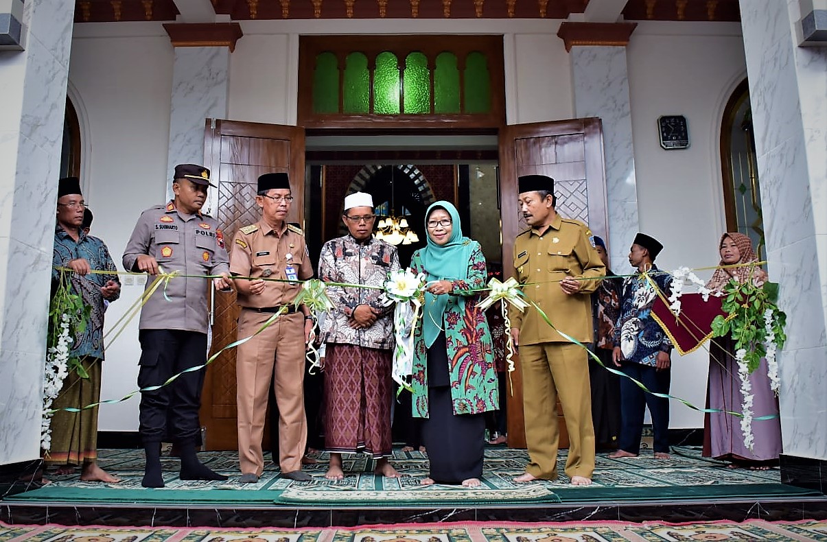 Bupati Tegal Umi Azizah menggunting pita sebagai tanda diresmikannya penggunaan Masjid Baeturrohman, di Pedukuhan Kemaron, Desa Tuwel, Kecamatan Bojong, Selasa (11/07/2023).