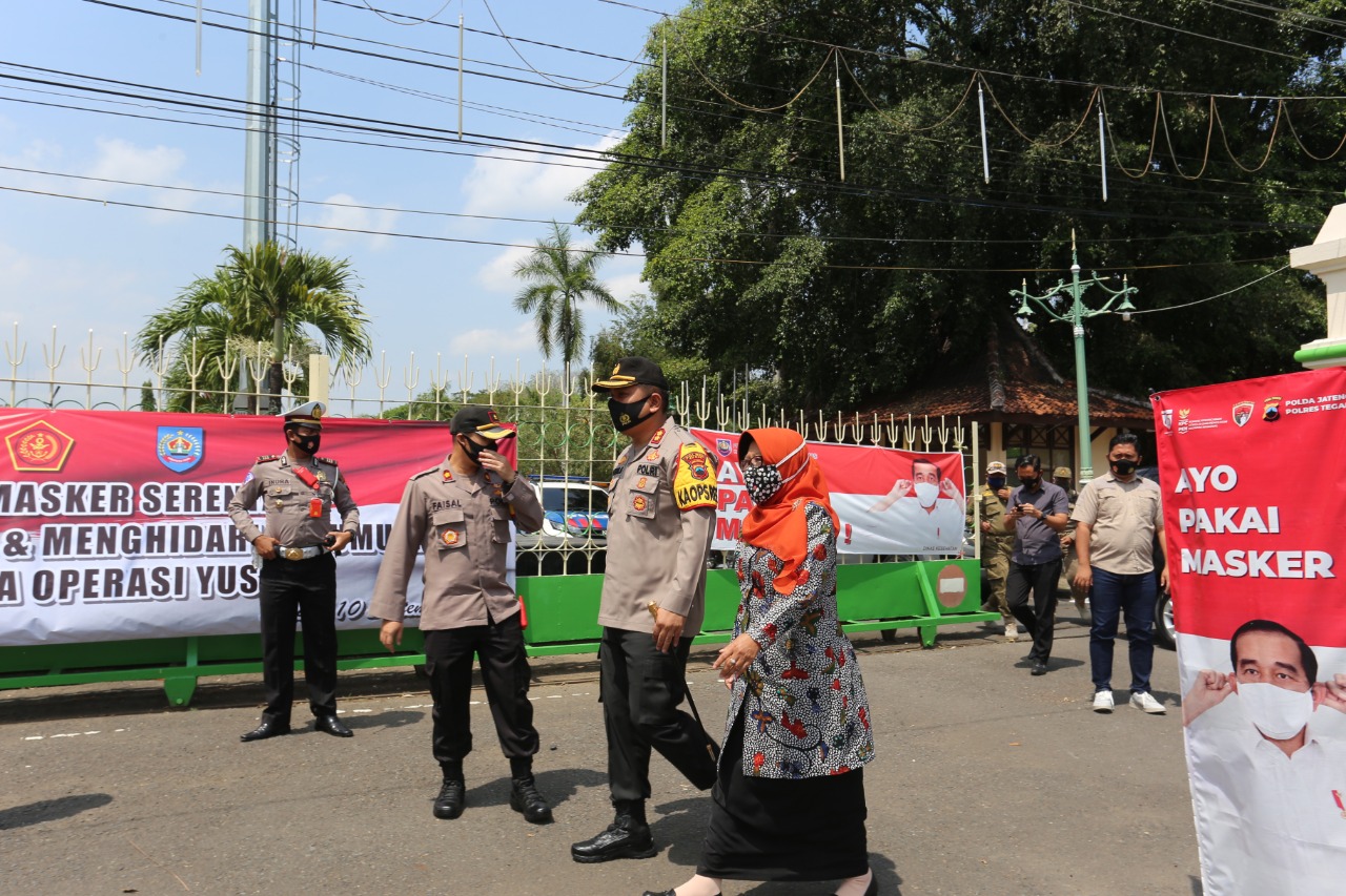 SLAWI, korantegal.com – Tingkatkan kewaspadaan masyarakat di tengah pandemi Covid-19, Bupati Tegal Umi Azizah dan Kapolres Tegal AKBP M Ikbal Simatupang beserta unsur TNI bagikan masker gratis di Alun-alun Hanggawana Slawi, Kamis (10/09/2020). Kegiatan ini merupakan bagian dari pembagian seratus ribu masker yang diadakan serentak di sembilan belas titik di wilayah Kabupaten Tegal.