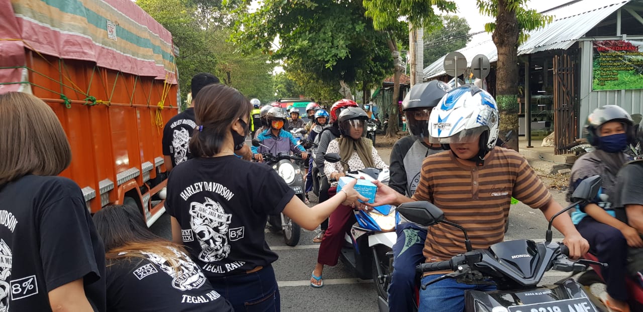 “Snack dan masker ini kami bagikan kepada tukang becak, tukang ojek, dan para pengguna jalan lainnya,” kata Ketua Jong Java Harley Davidson Motor Club Tegal Raya, Dimas Setiawan.