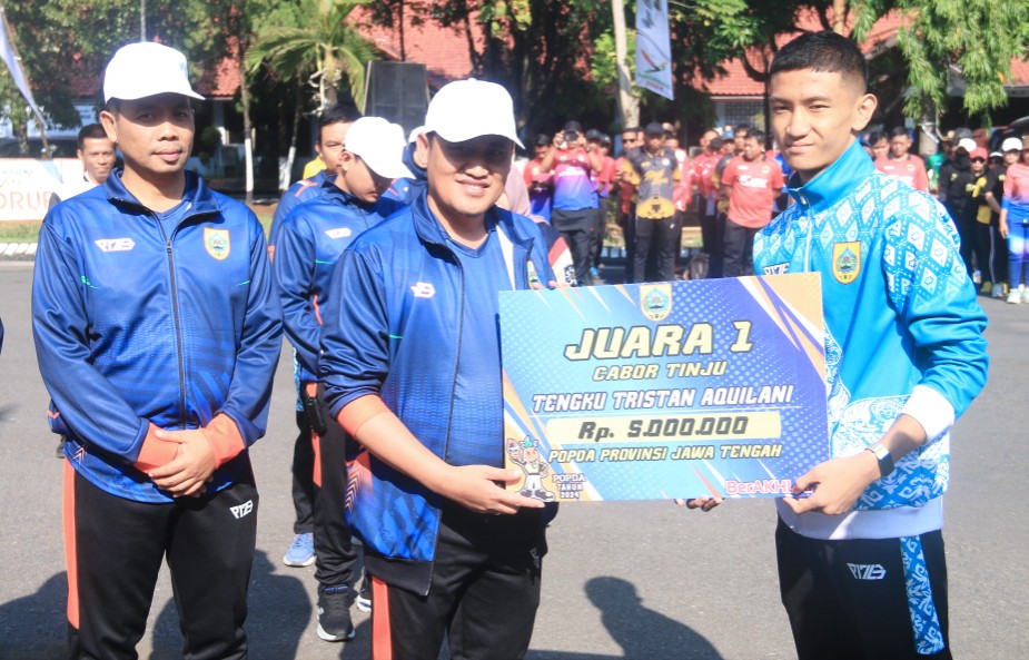 Bupati Pemalang memberikan hadiah kepada atlit yang berhasil meraih medali di POPDA Jateng 2024.