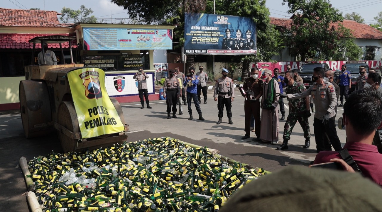 Sebelum seluruhnya digilas dengan kendaraan berat, Kapolres Pemalang bersama segenap Forkopimda, tokoh masyarakat dan tokoh agama melaksanakan pemusnahan barang bukti miras dan obat keras secara simbolis.