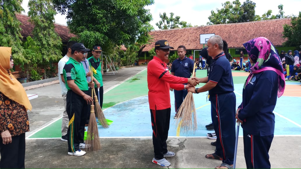 PANGKAH – Camat Pangkah Bambang Sihana memberikan bantuan peralatan kebersihan di SMP Negeri 1 Pangkah, Kabupaten Tegal, Jumat (21/2). Bantuan ini sebagai wujud keseriusannya dalam menangani sampah di wilayah kerjanya. Bantuan diserahkan seiring dengan Hari Ulang Tahun (Harlah) SMPN 1 Pangkah yang ke 52 tahun.