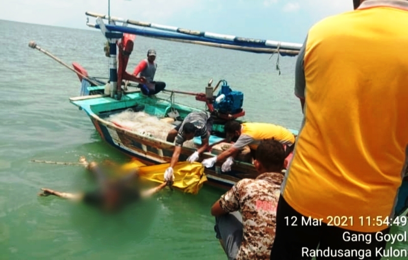 Jasad Carsono (56) saat sedang dievakuasi oleh nelayan dan petugas.