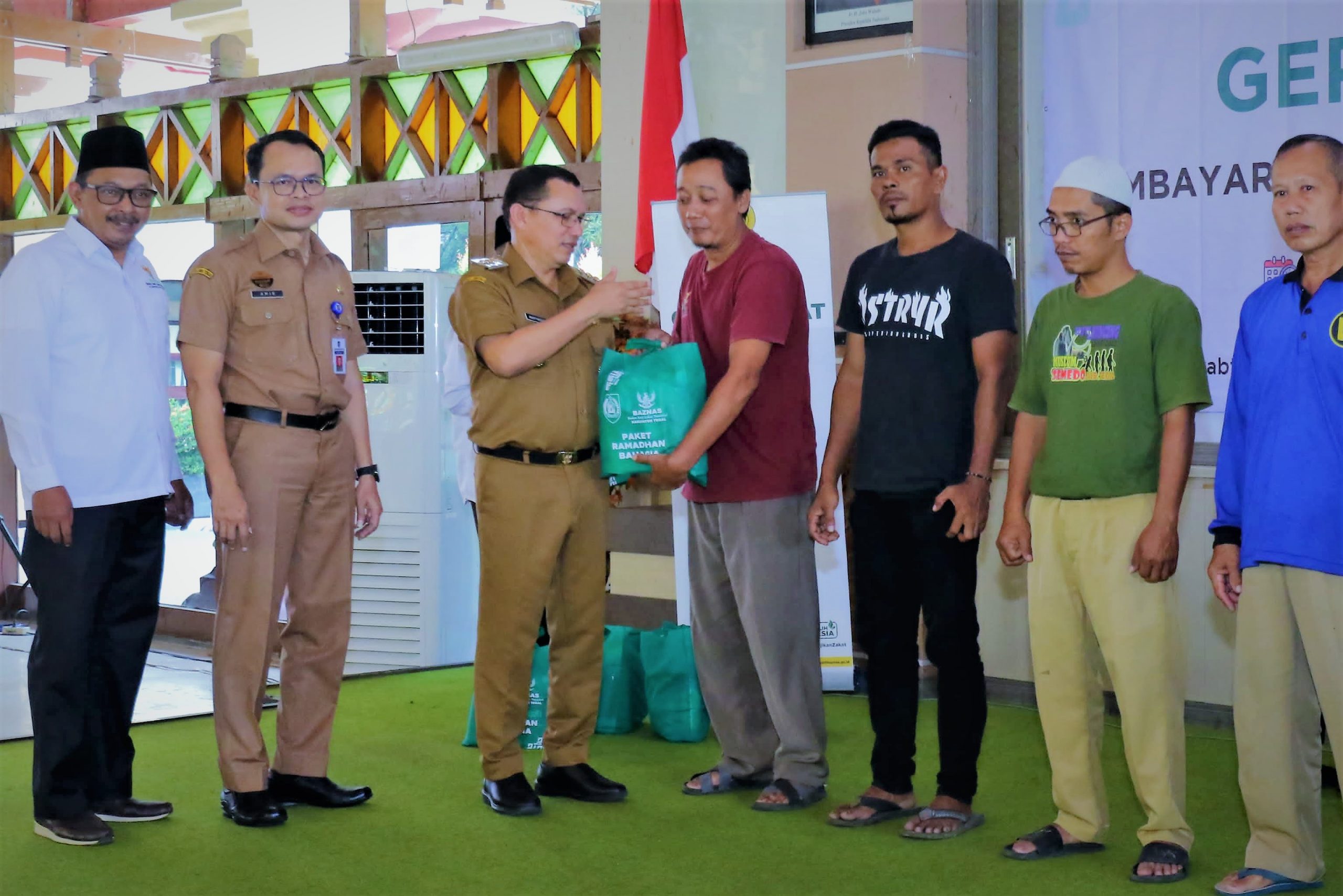 Pj Bupati Tegal Agustyarsyah salurkan paket bingkisan Ramadhan Bahagia dari Baznas Kabupaten Tegal pada kegiatan Gerakan Cinta Zakat di Pendopo Amangkurat Kantor Bupati Tegal, Senin (25/03/2024).