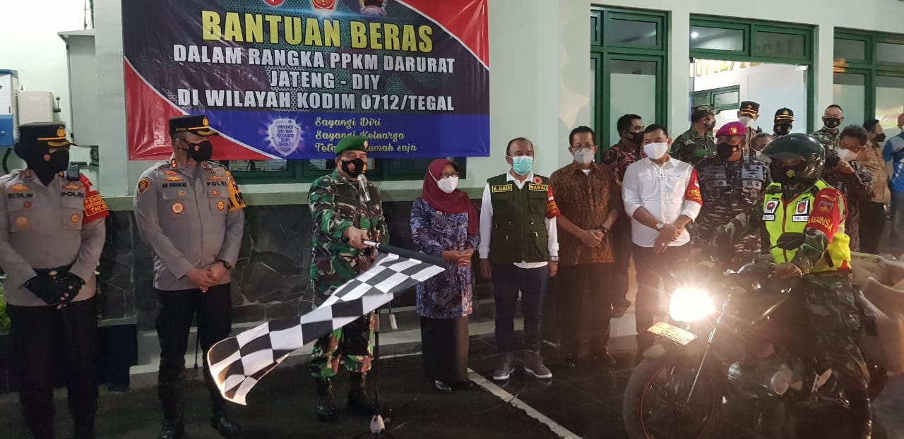 Komandan Kodim 0712 Tegal Letkol Inf Sutan Pandapotan Siregar mengatakan, bantuan beras sebanyak 35 ton ini berasal dari TNI. Beras disalurkan ke masyarakat Kota Tegal sebanyak 15 ton dan Kabupaten Tegal 20 ton. Selain beras, pihaknya juga menyalurkan bantuan obat sebanyak 612 paket. Untuk paket 1 dibagikan kepada masyarakat yang sedang menjalani isolasi mandiri di rumah dengan gejala ringan, paket 2 gejala sedang dan paket 3 gejala berat.