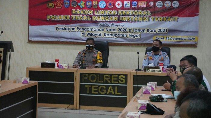 SLAWI, korantegal.com – Jelang libur Natal dan Tahun Baru (Nataru) 2020, Lintas Sektoral Kabupaten Tegal mengadakan rapat koordinasi guna membagi pos-pos pengamanan yang tersebar di 11 titik. Rakor yang berlangsung di ruang Praja Gupta Polres Tegal pada Selasa (15/12/2020) ini diikuti oleh tim lintas sektoral, di antaranya yaitu Kepolisian, TNI, Satpol PP, Dinas Perhubungan, Jasa Raharja, PMI, pengelola objek wisata, dan lain-lain.