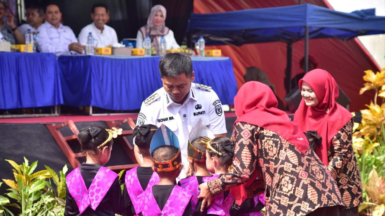 Bupati Tegal Ischak Maulana Rohman menyalami anak pelajar yang baru saja membawakan tarian tradisional sebagai pembuka acara Bupati Tilik Desa di Desa Karanganyar, Kecamatan Kedungbanteng, Rabu (03/09/2025).