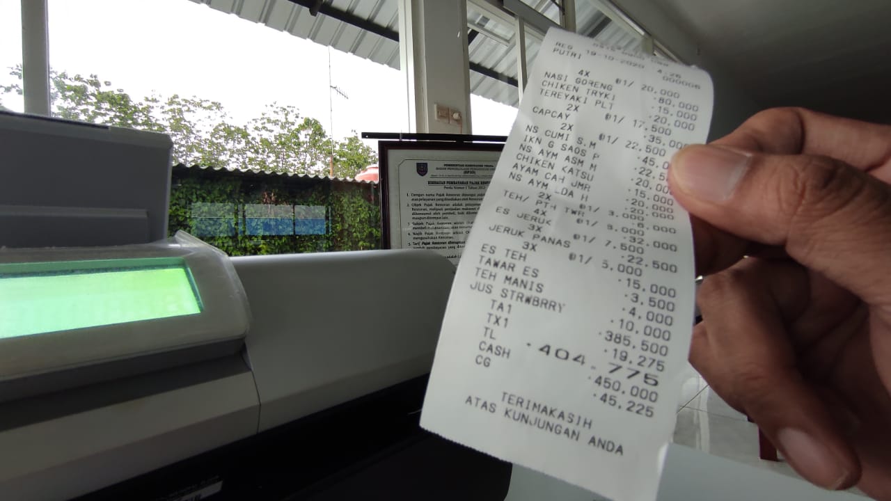 Bukti transaksi berupa struk pembayaran restoran dengan lampiran pajaknya.