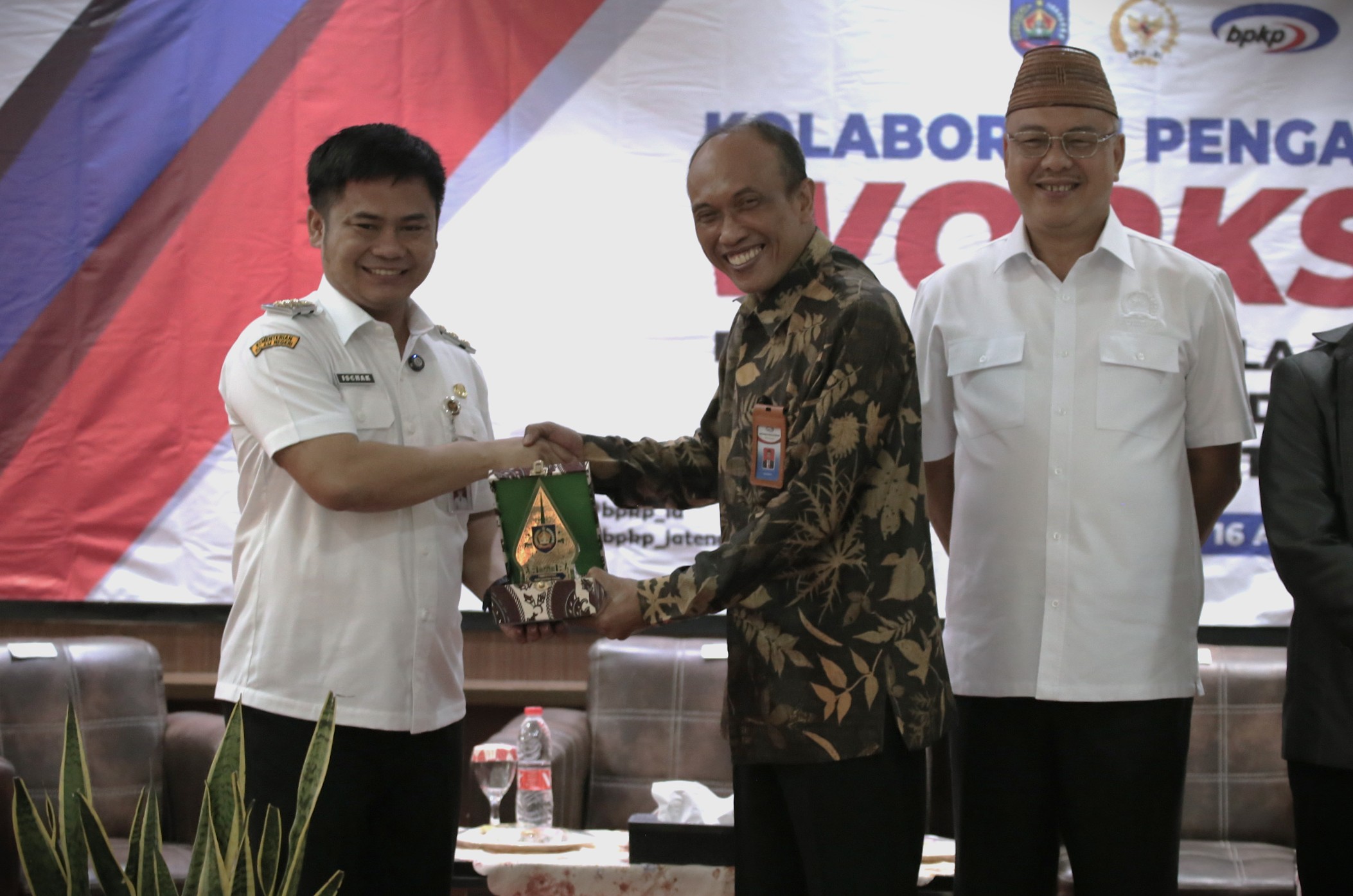 Kepala Perwakilan BPKP Provinsi Jawa Tengah Tri Handoyo (kanan) menerima cindera mata dari Bupati Tegal Ischak Maulana Rohman (kiri) saat acara Workshop Evaluasi Pengelolaan Keuangan dan Pembangunan Desa Tahun 2025 di Gedung PMI Kabupaten Tegal, Rabu (16/04/2025).