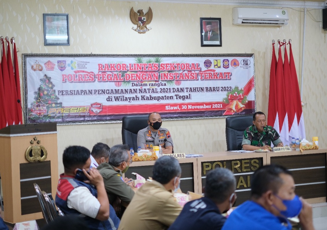 SLAWI, korantegal.com – Jelang persiapan Natal 2021 dan Tahun Baru 2022, Polres Tegal melaksanakan rapat koordinasi dengan lintas sektoral yang dipimpim langsung oleh Kapolres Tegal AKBP Arie Prasetya Syafa’at bertempat di gedung Praja Gupta, Selasa (30/11/2021).