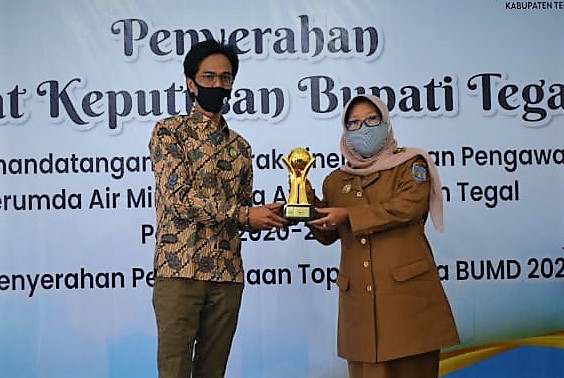 Bupati Tegal Umi Azizah saat menerima secara simbolis penghargaan Top Pembina BUMD 2020 dari Majalah Top Business. Penyerahan dilakukan Direktur Perumda Air Minum Tirta Ayu Brahmono Weko Pujiono di Aula Kantor Perumda Tirta Ayu, Selasa (01/09/2020).